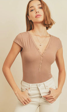 Light Camel Ribbed Round Neck Short Sleeve Henley Bodysuit