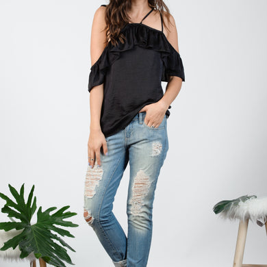 Ruffle Off the Shoulder Strap Washed Satin Top