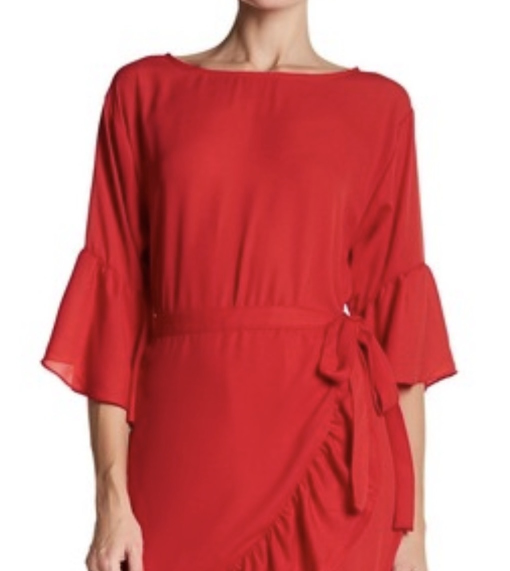 - Boatneck- Ruffled elbow sleeves- Wrapped front with self-tie at waist- Chiffon construction- Ruffled hem- Lined100% polyester