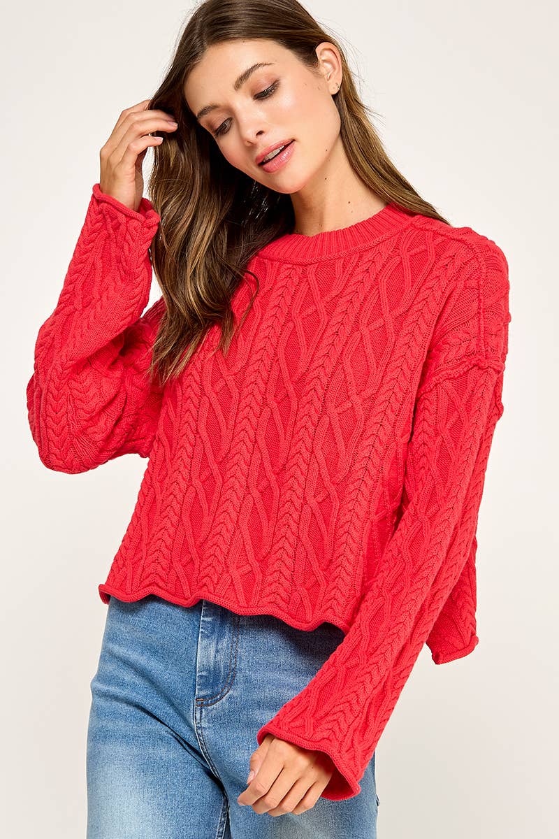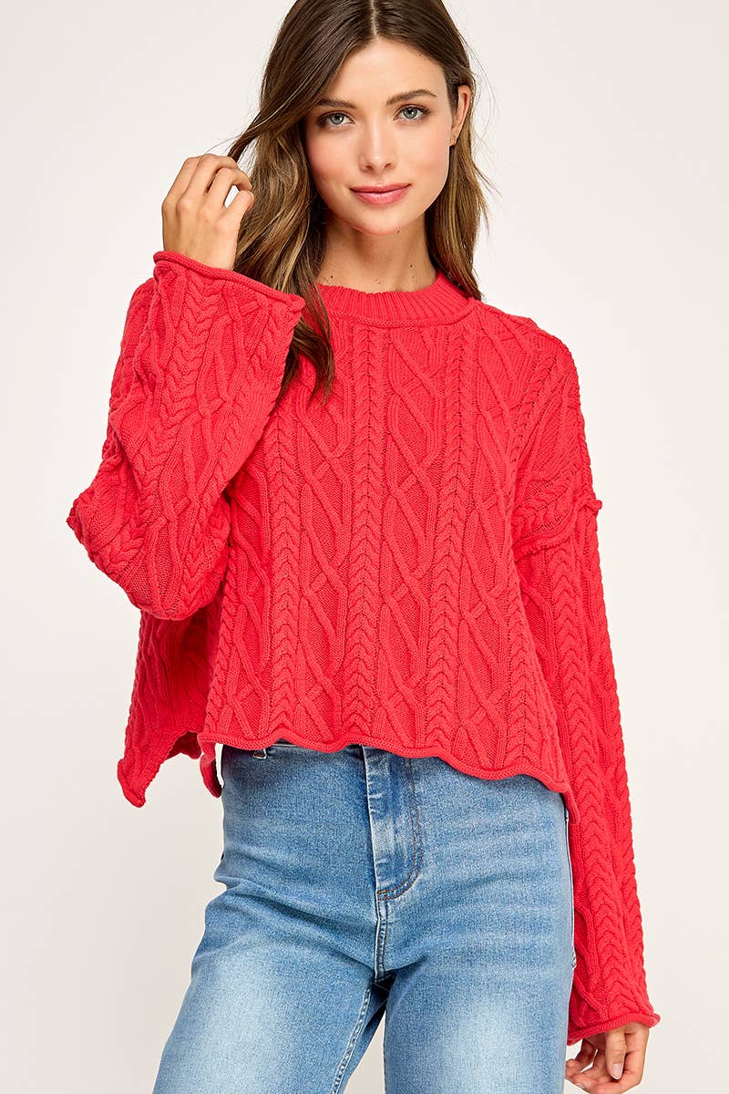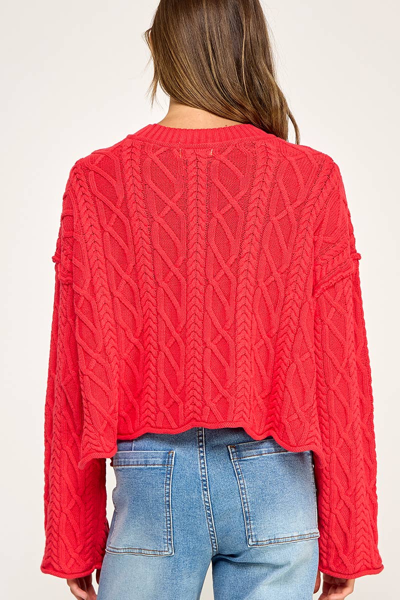 Add cozy texture to your wardrobe with this charming cropped pullover. It features a blend of intricate cable knit patterns and a relaxed fit. Perfect for a stylish and comfortable look, easily paired with high-waisted bottoms. -100%cotton