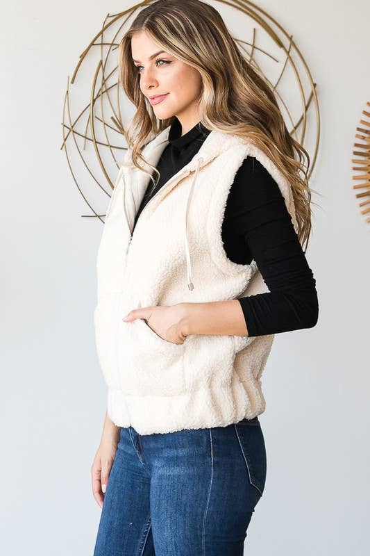 100% POLYESTER SLEEVELESS HOODED ZIPPER FRONT SHERPA VEST WITH FRONT POCKET DETAIL