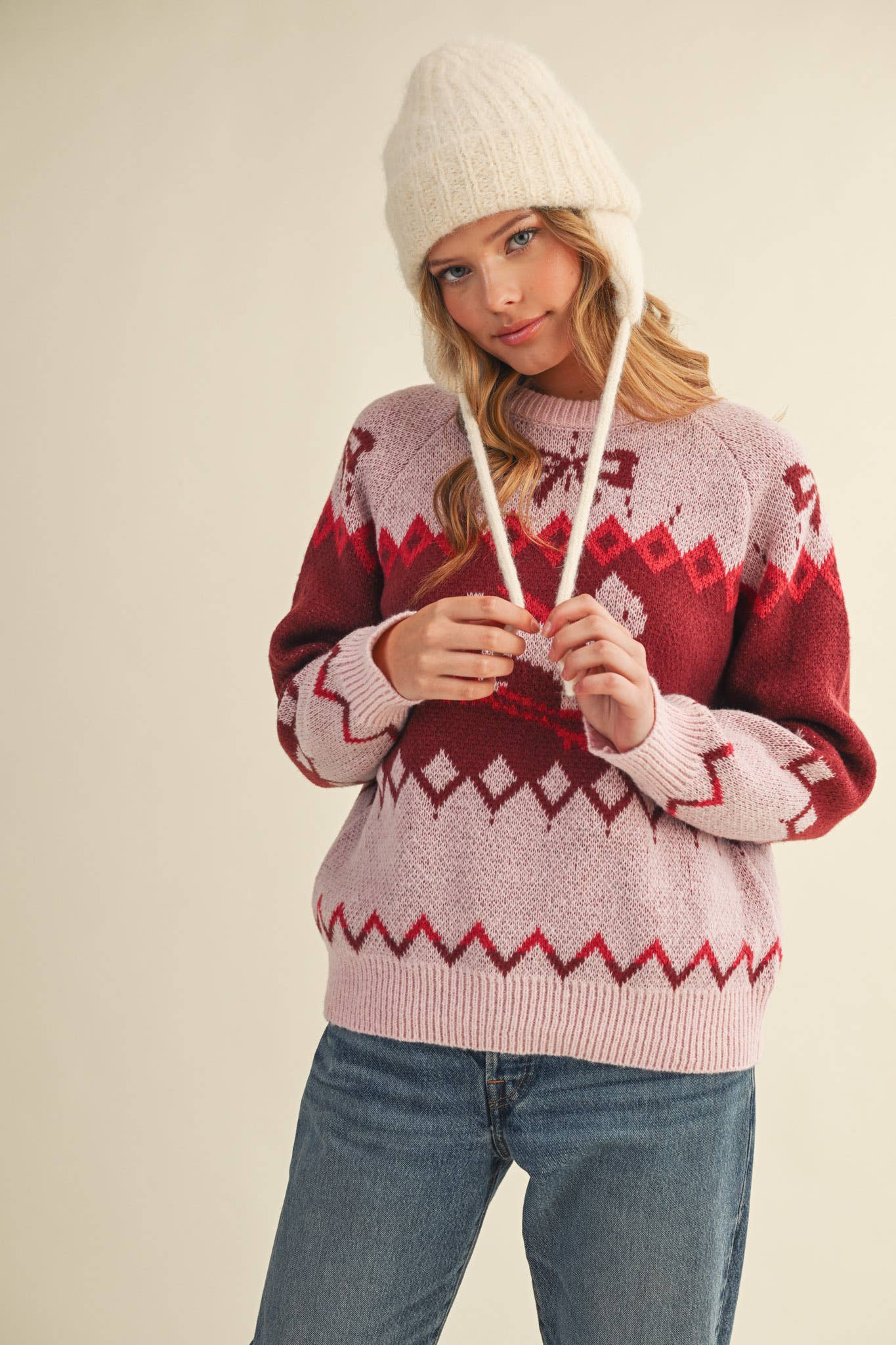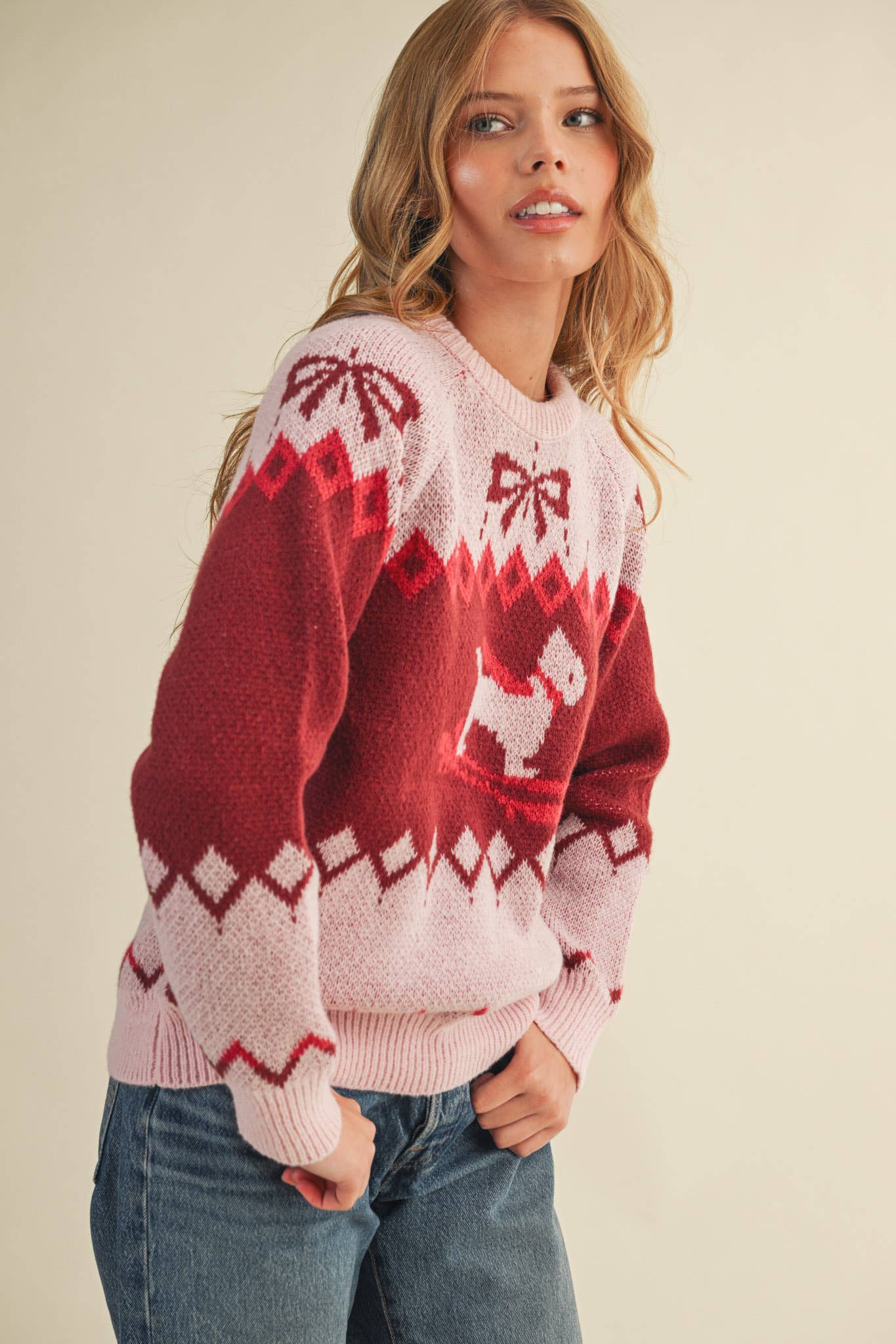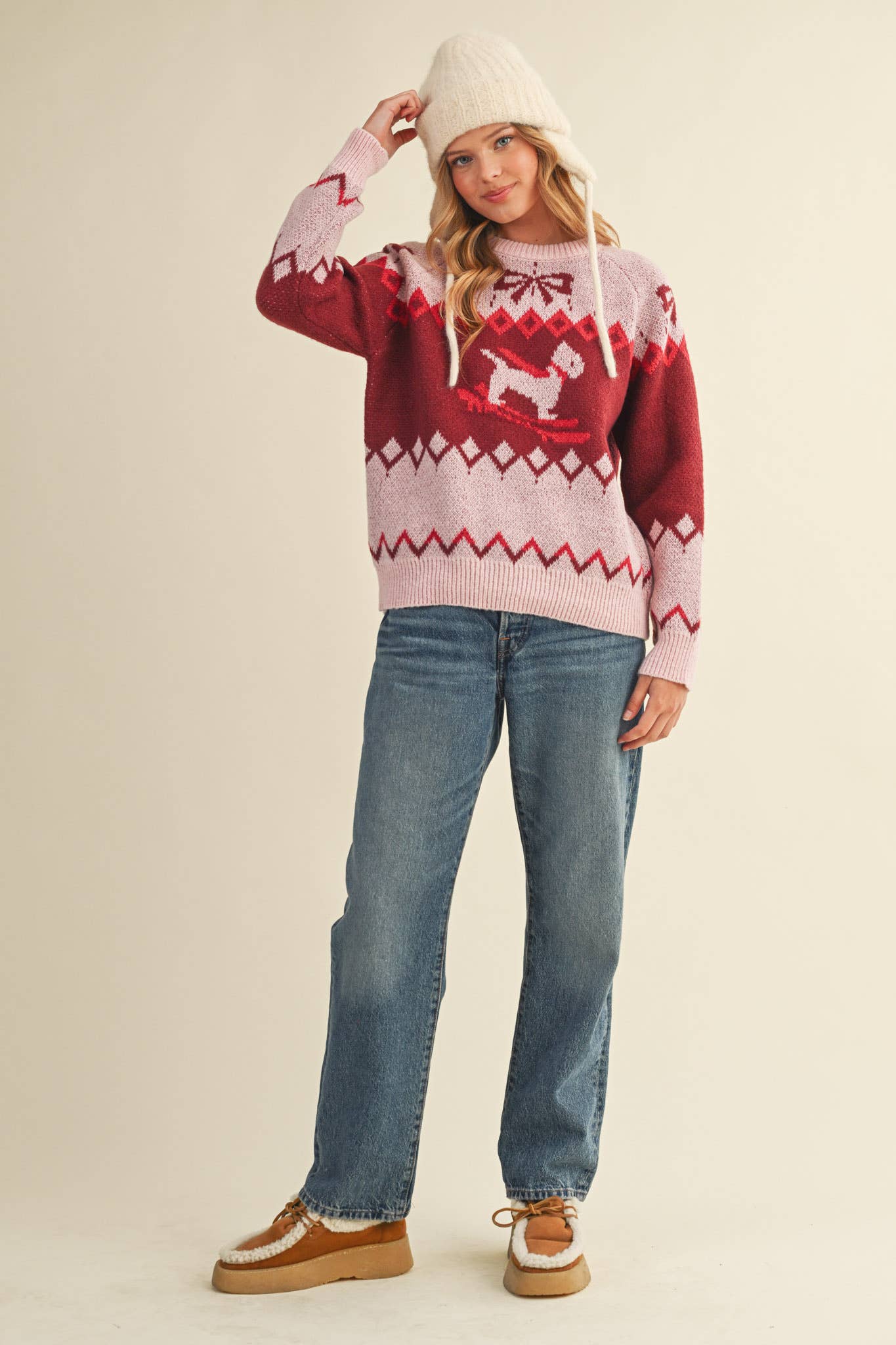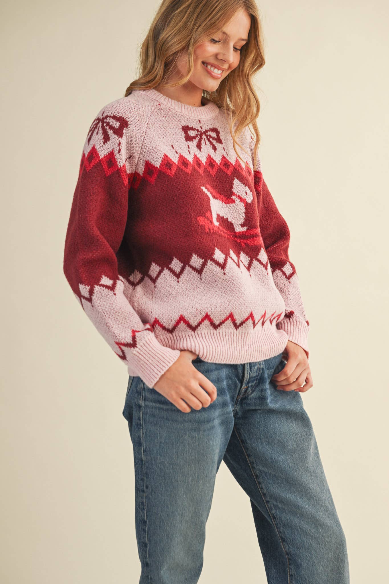 + Dog motif sweater + Round neckline + Raglan seam long sleeves + Slouchy relaxed fit pullover + Dog and bow knit design + Ribbed collar, cuffs, and hem + Model is 5' 7.5" 30-25-36 and wears a S