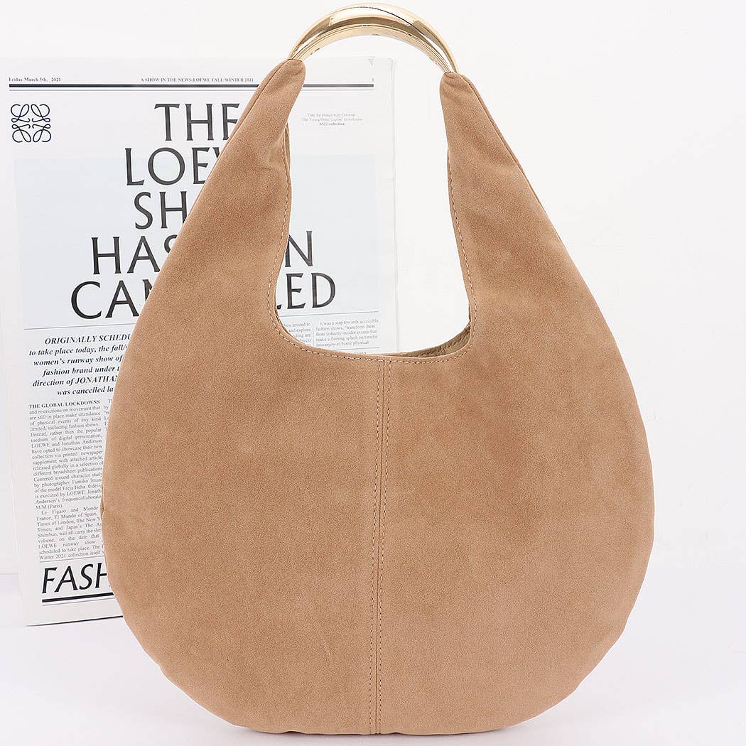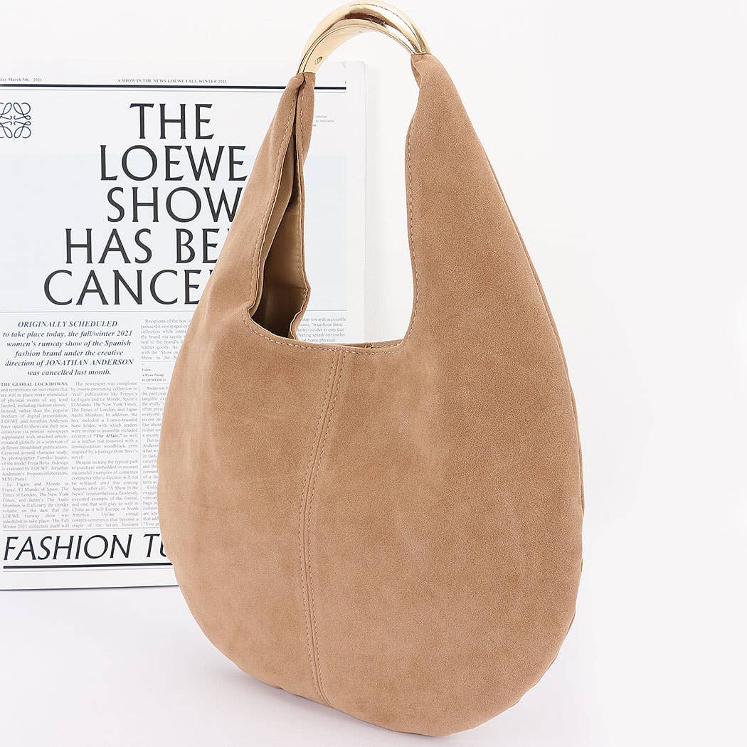 * This is a Faux Suede Leather Hobo Bag from H&D Accessories. It has a soft, slouchy silhouette with a sleek metal handle on top. The faux suede material gives it a textured look, and a center seam adds subtle detail. Whether you're heading to a coffee meetup, a weekend market stroll, or just out for a casual day, it adds an effortlessly cool vibe to your look.